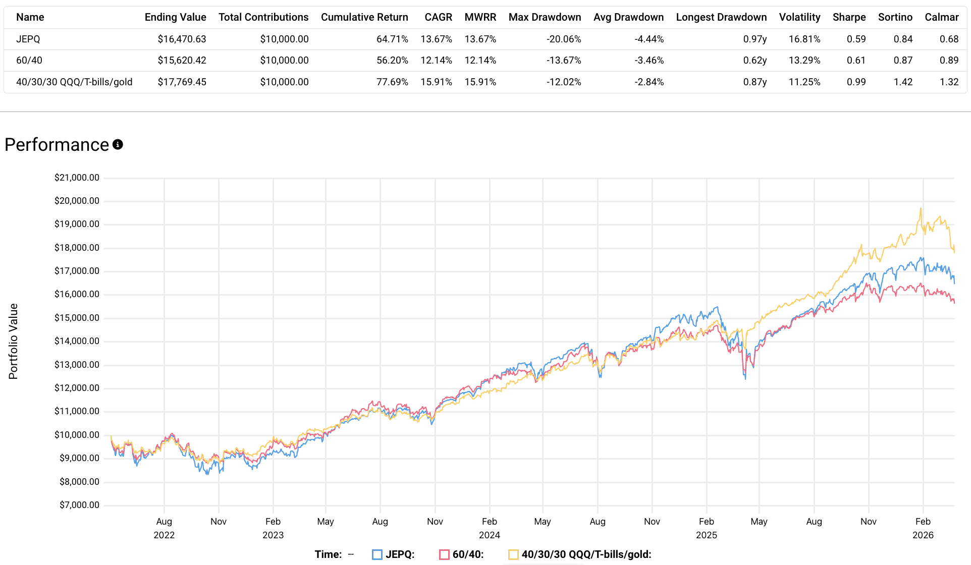 In an admitted attempt purely to appeal to the sensibility of the dividend bros on Reddit and Twitter, a generous compromise to scratch the itch here would be to maybe include JEPQ as a small percentage of the portfolio but not the whole thing, basically making it an “income sleeve” of sorts. Portfolios don't have to be all-or-nothing. This would be adding an option writing overlay to an otherwise traditional portfolio. That is, for a hypothetical example, you could hold the NDX via QQQM, some T-bills, some gold, and a dash of JEPQ, and have a well-diversified setup.