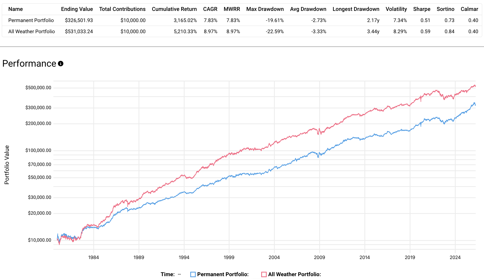 As a result, you'll notice the Permanent Portfolio wins out on Sharpe, Sortino, and Calmar, which are measures of risk-adjusted performance.
